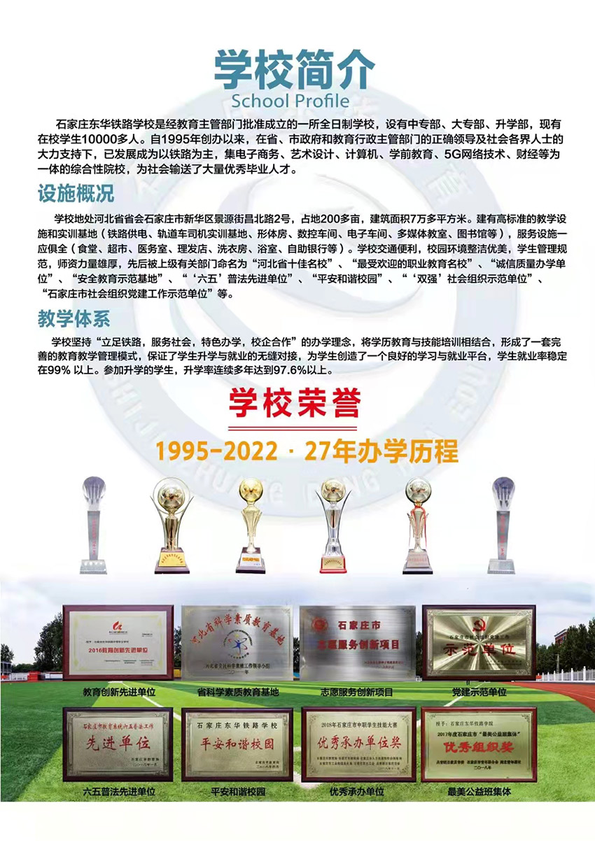 石家庄东华铁路学校是经教育主管部门批准成立的一所全日制学校,设有中专部、大专部、升学部,现有在校学生10000多人。自1995年创办以来,在省、市政府和教育行政主管部间的正确领导及社会各界人主的大力支持下,已发展成为以铁路为主,集电子商务、艺术设计、计算机、学前教育、5G网络技术、财经等为一体的综合性院校,为社会输送了大量优秀毕业人才。